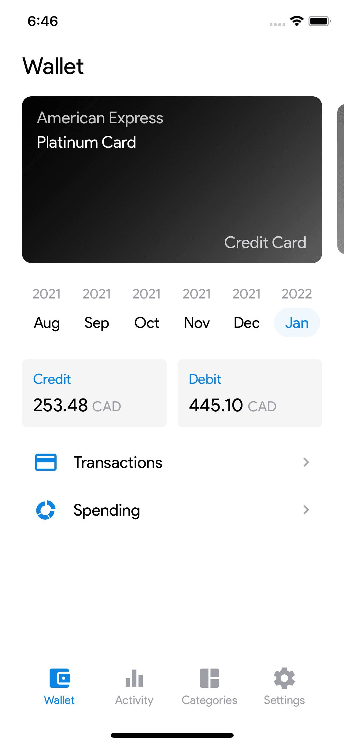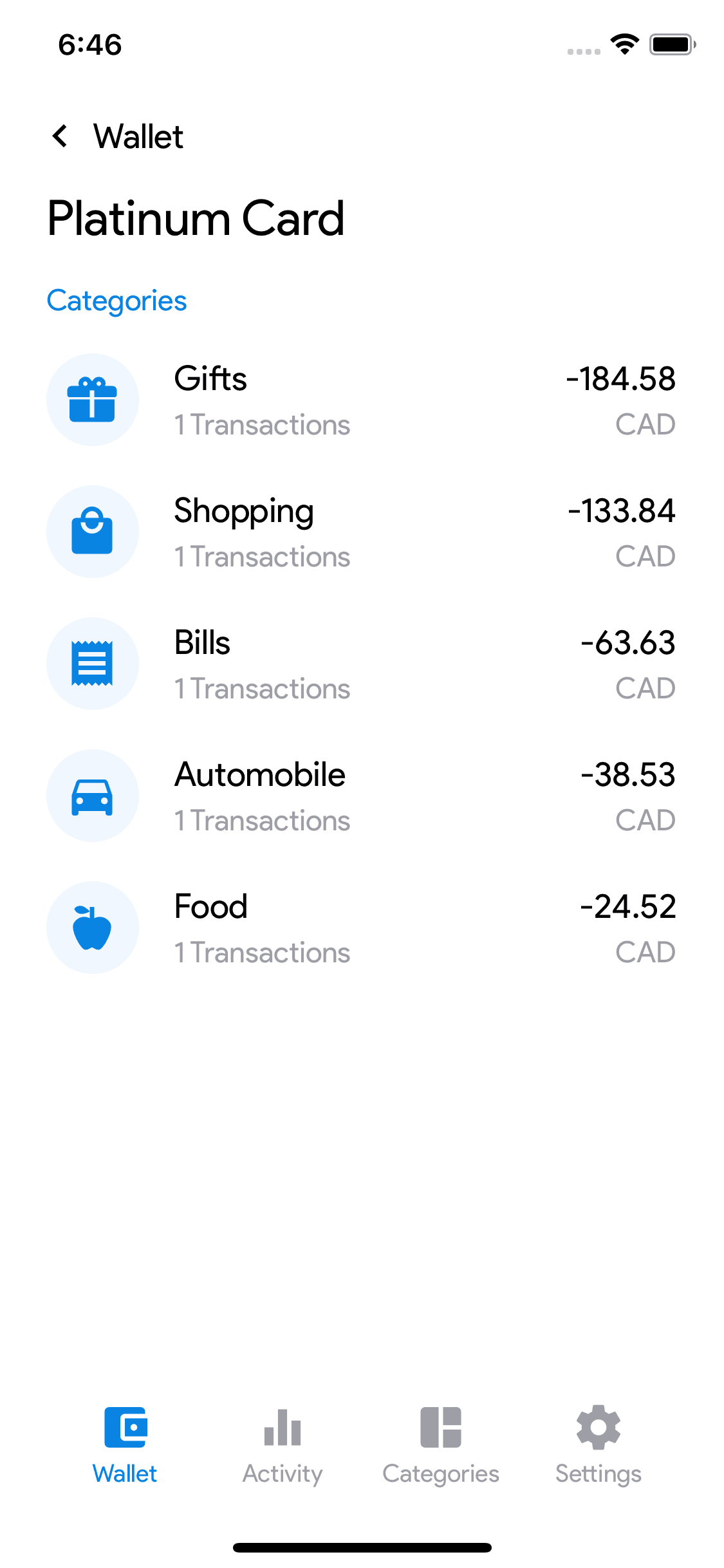 A breakdown of spending by category filtered for a given card and month. This screen can only be accessed from the wallet screen.