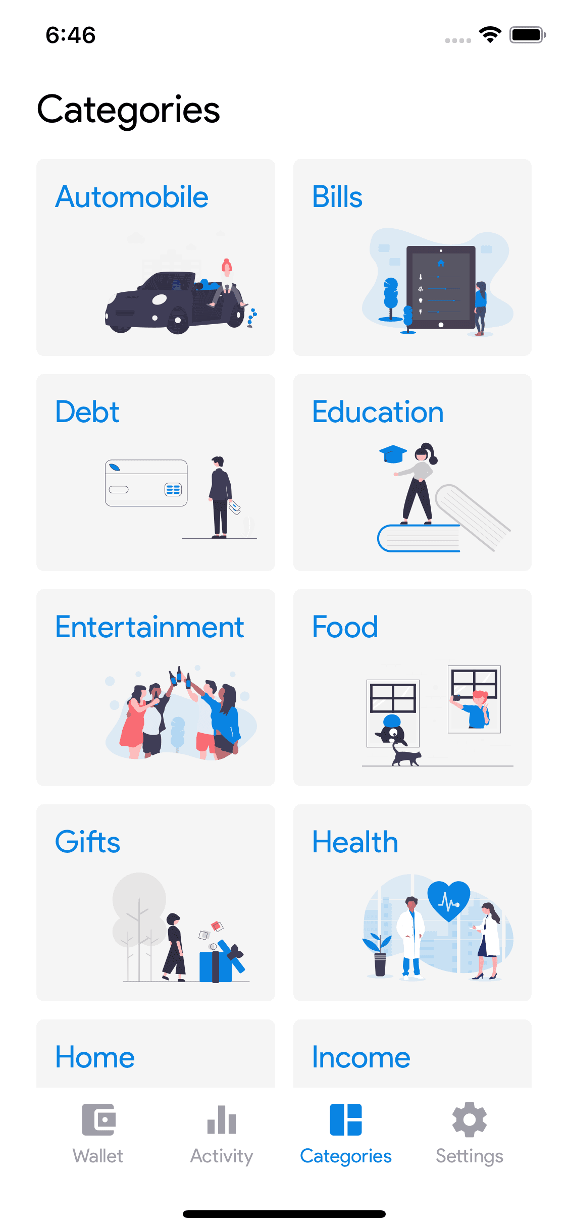 A grid of categories tiles where the user can view a list of transactions for a given category.