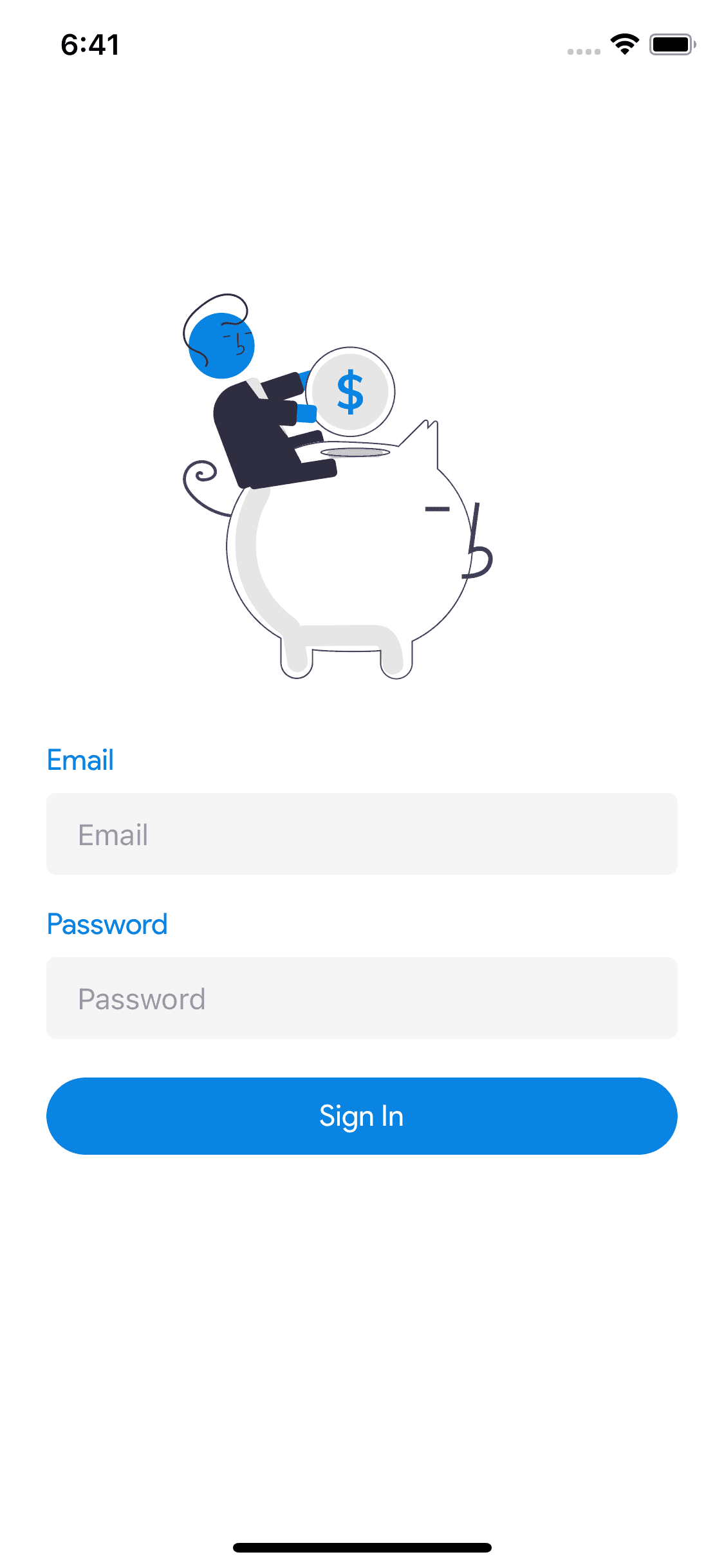 A simple generic login screen with a simple graphic for saving money. It'd be best to update it with a logo for branding if the application were to ever go public.