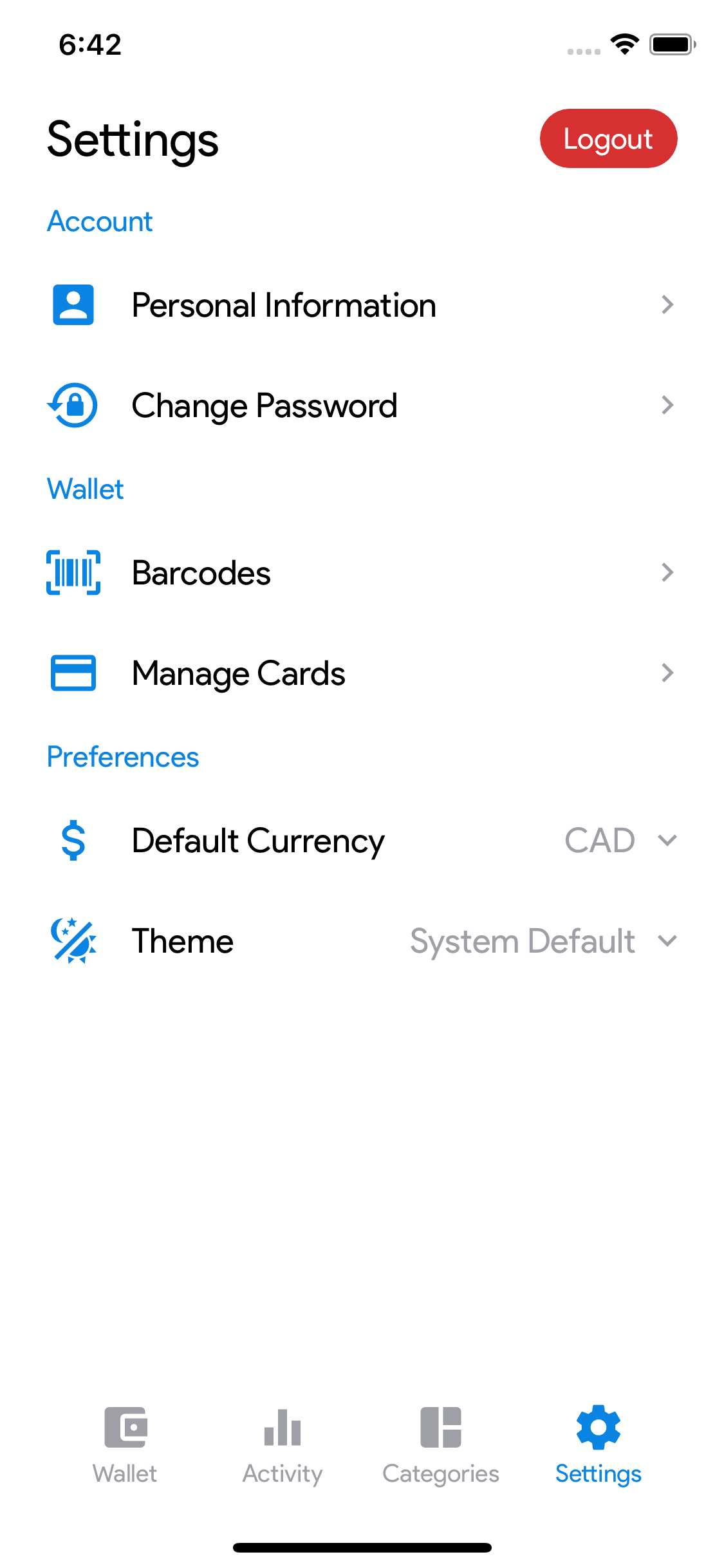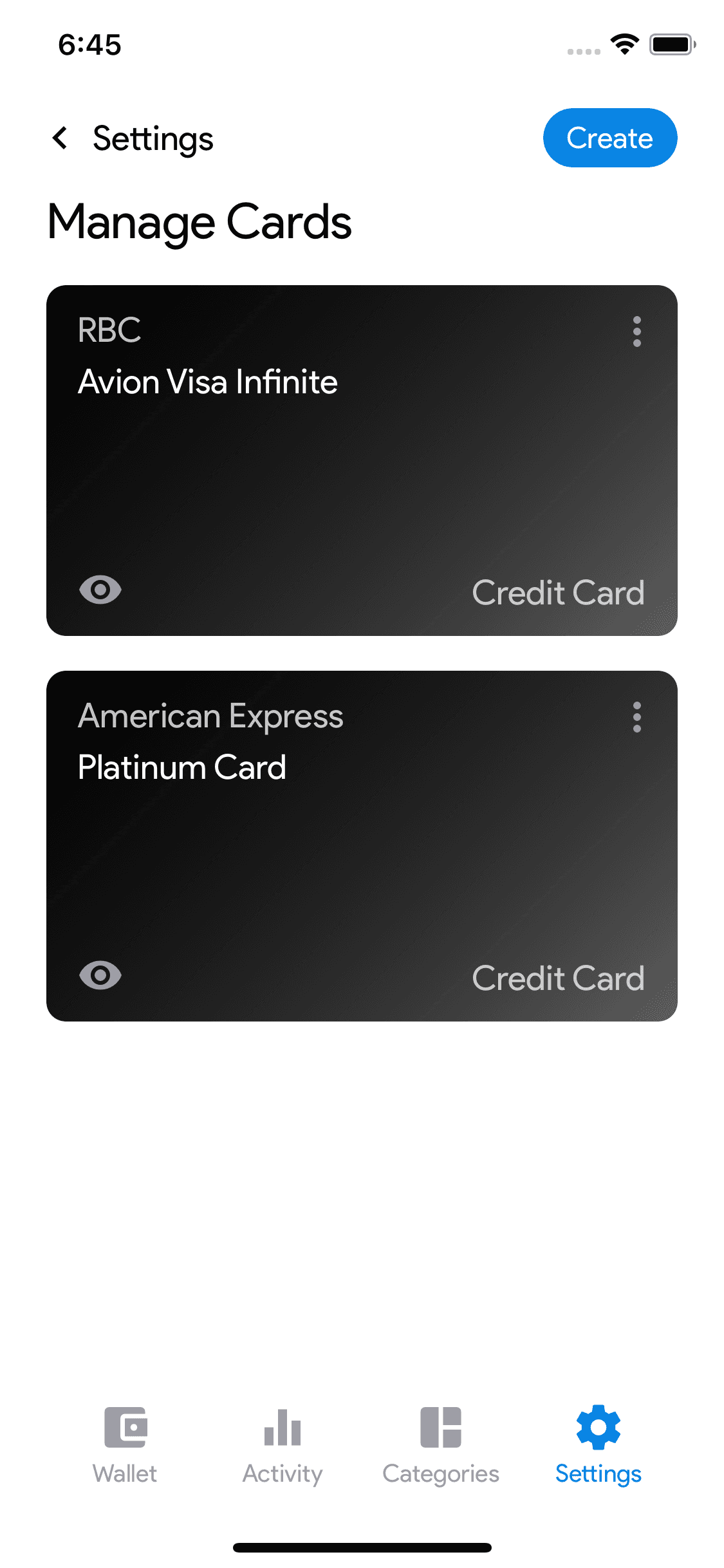 A list transactions with a filter for a given card and month. The user can manage their transactions by long pressing on a transaction. This screen can only be accessed from the wallet screen.
